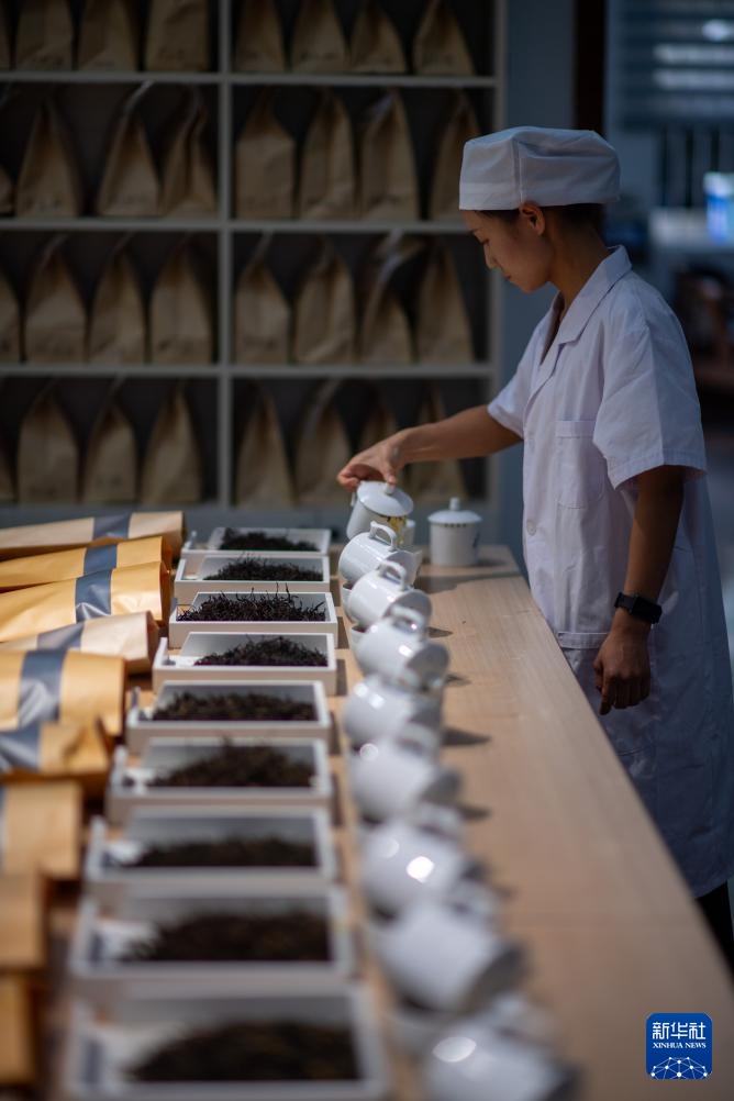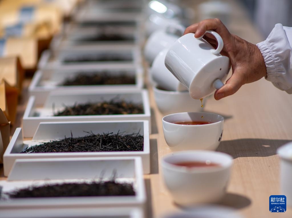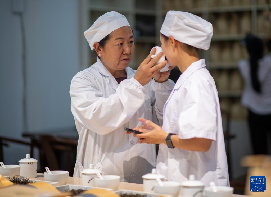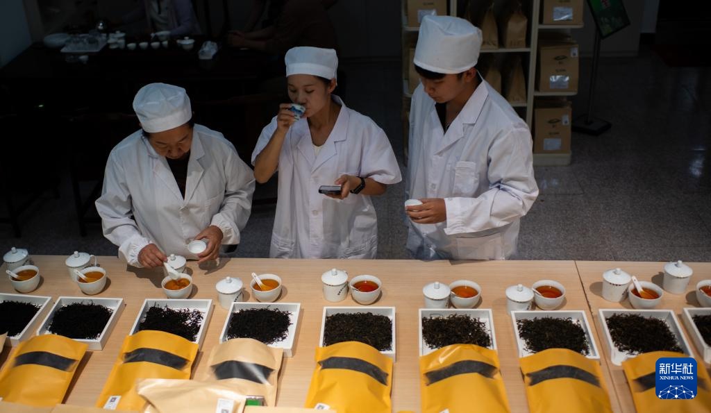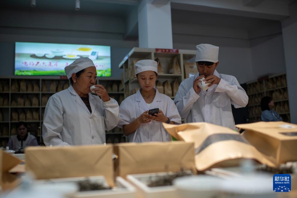 4月22日,云南省临沧市双江县茶叶检测品荐溯源中心的专家在评审茶叶。新华社记者 江文耀 摄