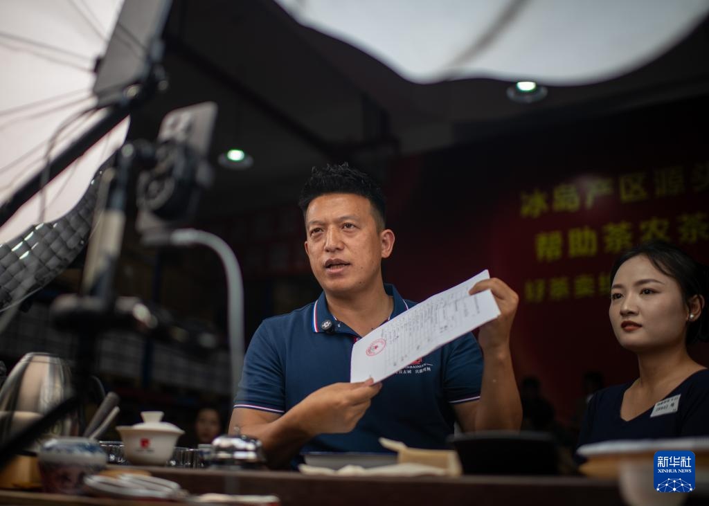 4月22日,云南省临沧市双江县主播在直播间展示品荐溯源报告。新华社记者 江文耀 摄